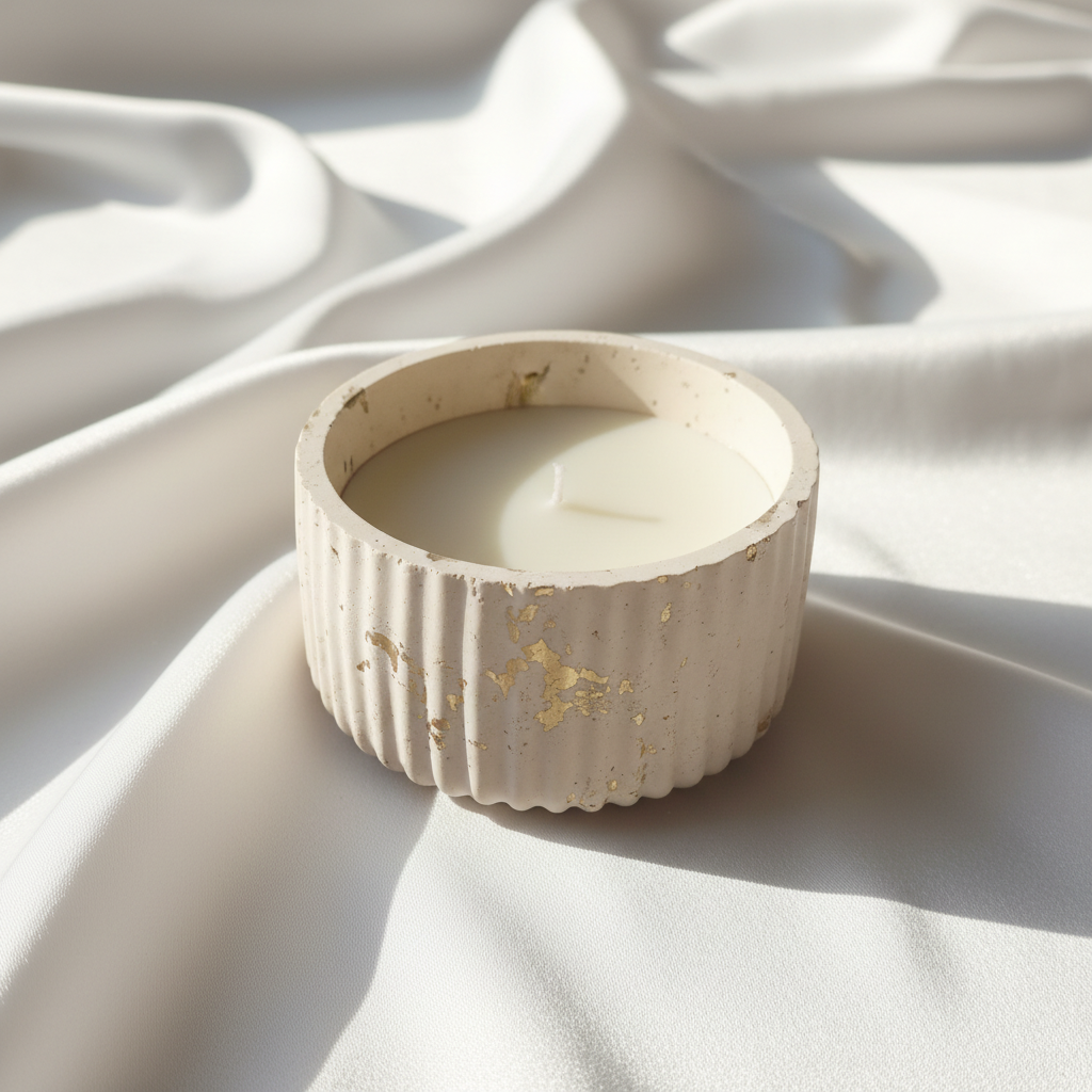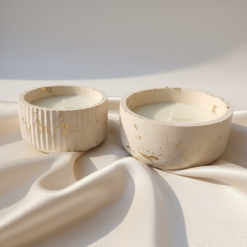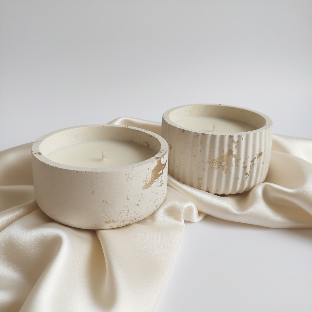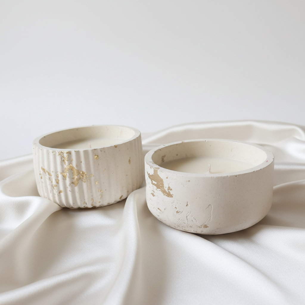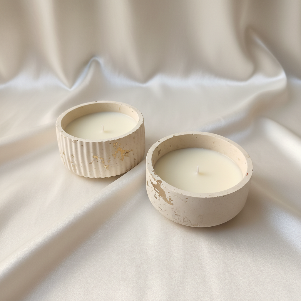 Indulge in artisanal luxury with the Gold Vessel Duo, a curated pairing of our Ribbed and Smooth Gold Vessel Candles. This exclusive set celebrates the beauty of contrast - textured and smooth, architectural and organic - united by the shimmer of gold leaf and the warmth of handcrafted concrete. Perfect for creating a cohesive, luxurious aesthetic in your home or as an unforgettable gift for someone special.